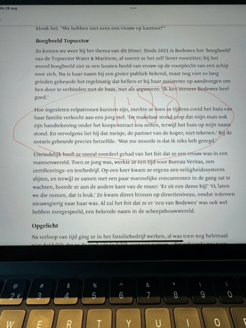 Ze laat de redacteur van dienst Hilda Bouwma optekenen hoe zeer in haar perceptie rolpatronen ingesleten kunnen zijn. Ze illustreert dat met de opmerking dat toen ze tijdens covid het huis van haar familie verkocht aan een jong stel de makelaar erop stond dat haar man ook zijn handtekening onder het koopcontract zou zetten, terwijl het huis, zo vertelt ze, nota bene op haar naam stond. En vervolgens liet die makelaar dat meisje, zo fulmineert ze verder, de partner van de koper, niet tekenen. "Bij de notaris gebeurde precies hetzelfde." "Wat me stoorde is dat ik niks heb gezegd."